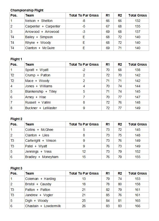 Now let’s get to the Results of the Tournament: The Champions played amazing with back to back scores of 66. Way to go Brian Nelson and Trip Shelton.